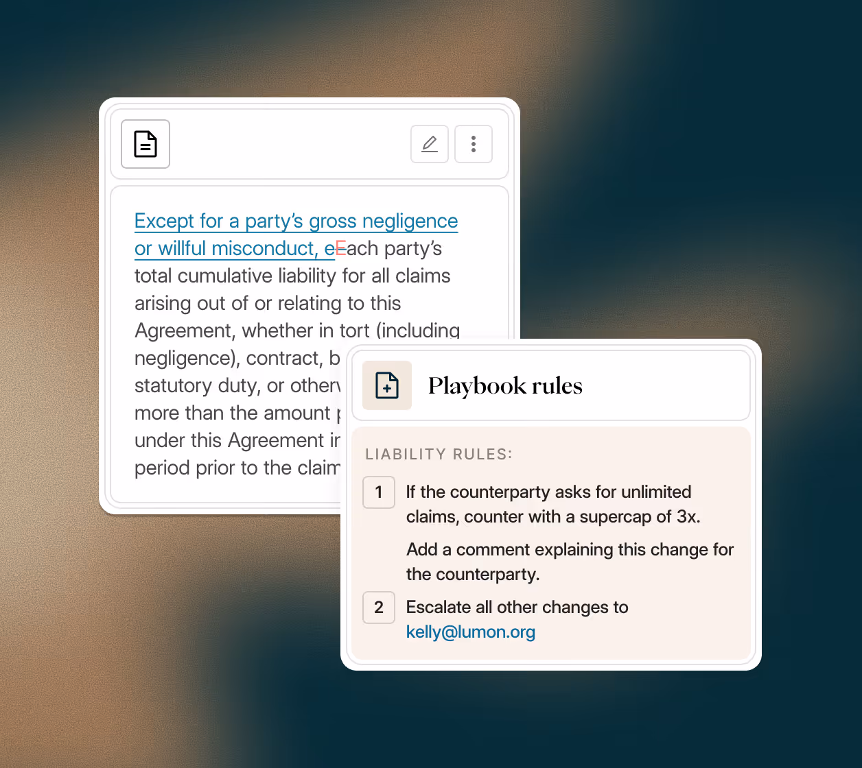 Your playbook is a plain-language explanation of your legal positions and what you’re willing to accept. Add rules for what to accept, reject, escalate to a team member, and counter-propose.